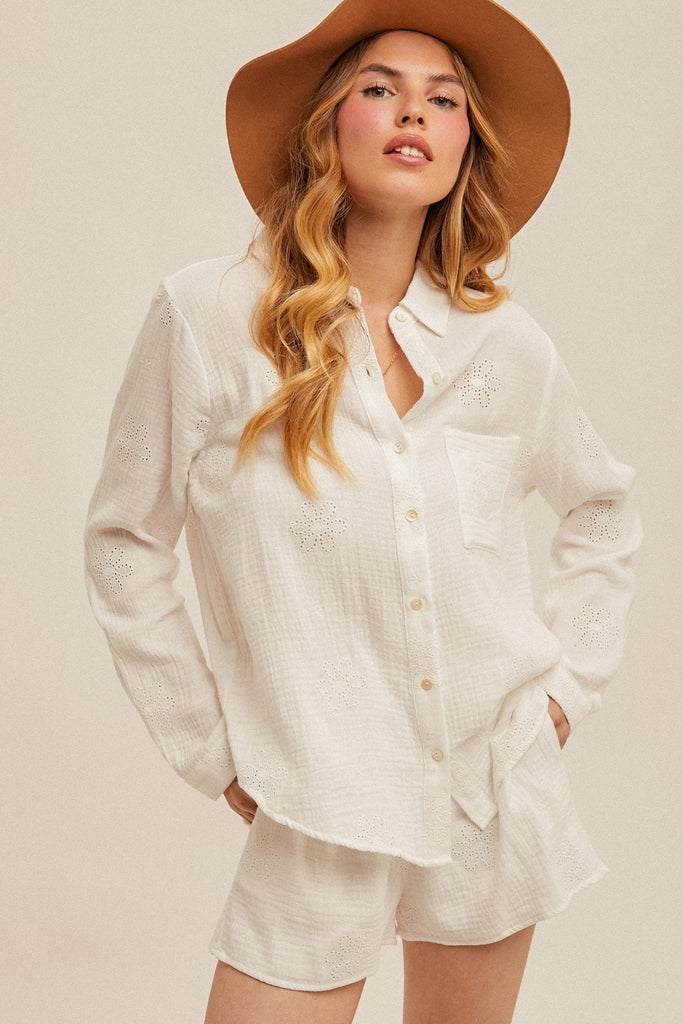 Eyelet Embroidery Double Gauze Button Down Shirt