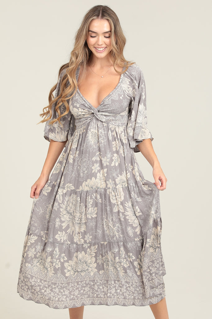Floral Scoop Neck Ruched Short Sleeve Midi Dress