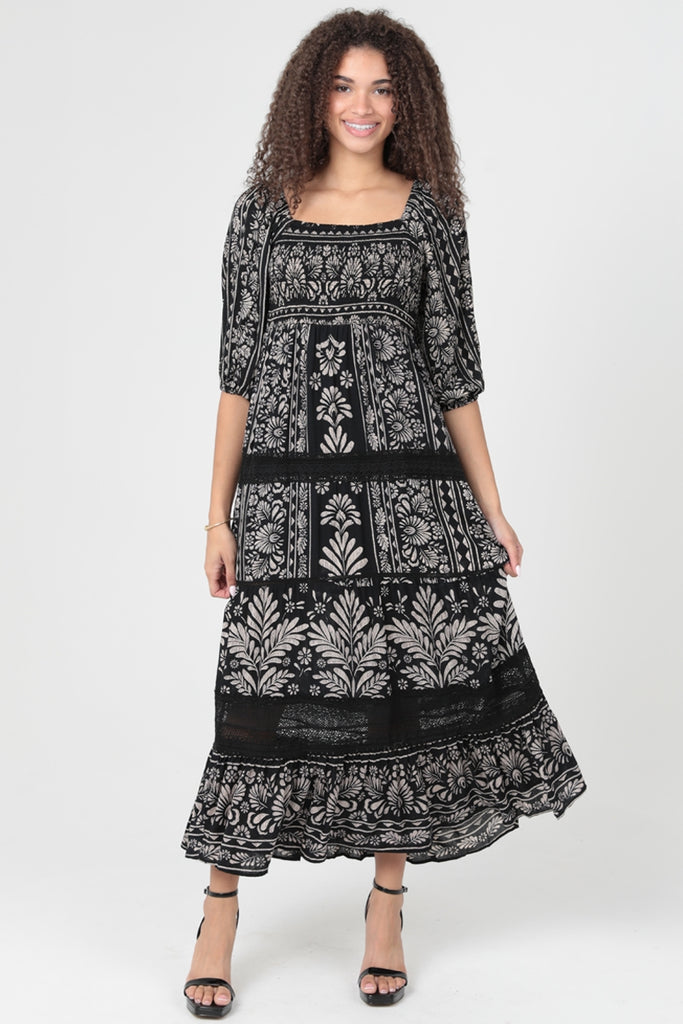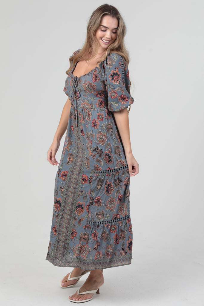 Smocked Bodice Lace Trim Half Sleeve Maxi Dress