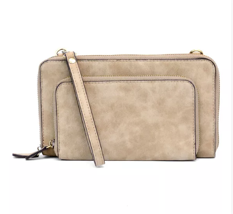 The convertible zip around features a front pocket for easy cell phone access and a total of nine card slots. The removable wristlet and cross body strap, printed lining and inside zipper for change are essential.